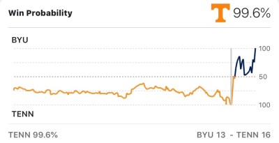 There is no game tying score if BYU doesn’t get a stop with a minute to go. Tennessee conservatively did try to chew out some clock which is hard to understand considering they were only up by a field goal at the time. They ran it up the middle 3 times and lost yardage. That doesn’t take away from what BYU did. They held the Vols to just 176 passing yards so there’s no guarantee that a delivery via air mail would have switched the odds in the game. Speaking of odds, this stop sparked a large increase in the probability of a BYU win. Fans in social media were quick to point out that until the end of regulation only Lloyd Christmas would have been hopeful about the outcome of a Cougar win.