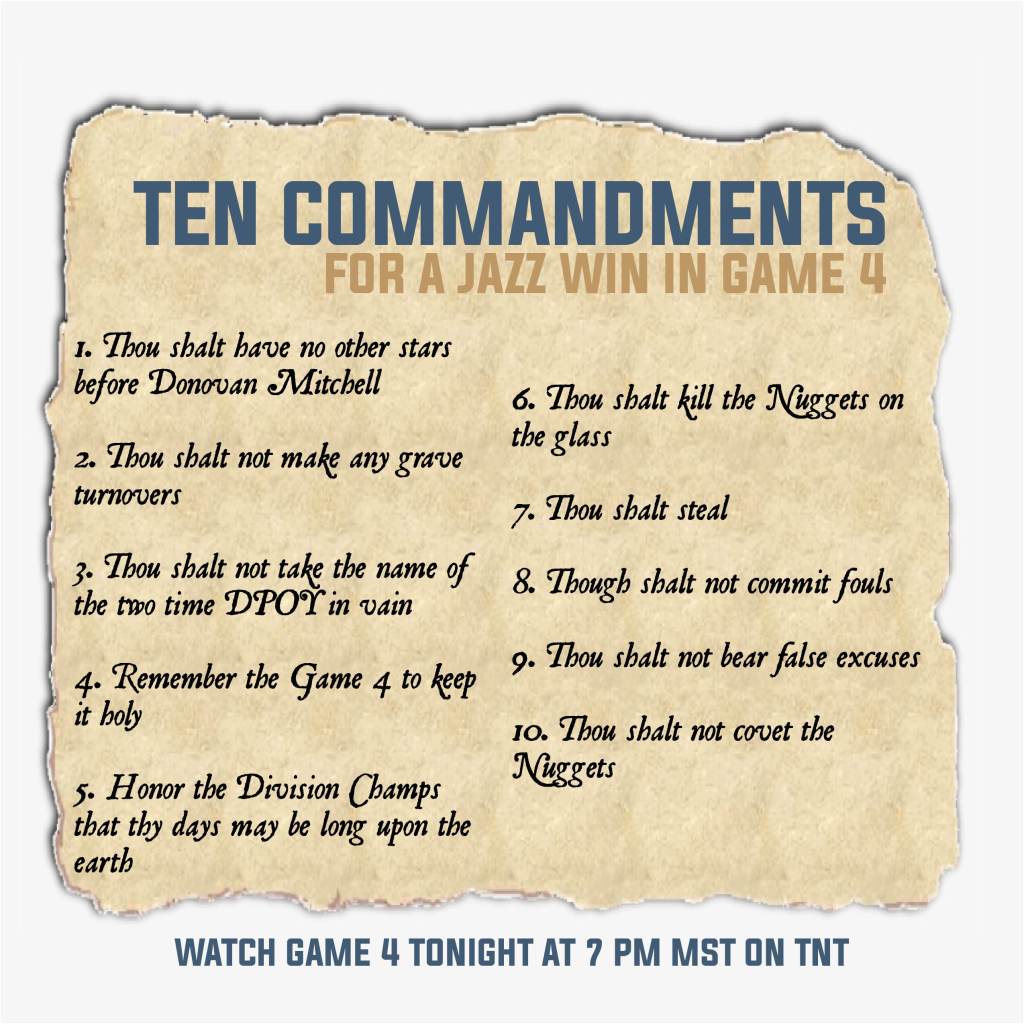 10. Thou shalt not covet the Nuggets: So what if the Nuggets won the Northwest Division title and the Jazz haven’t won it since 2017 before Donovan was a rookie? This is one of the deepest divisions in the league. We have four teams in our division in the playoffs, and this has been the case for three straight years. Don’t covet their center’s offensive ability. When Gobert is at his best, he is the best center in the league. Don’t covet their slew of guards. Donovan Mitchell is greater than the sum of their parts. Don’t covet the Nuggets when you are the Utah Jazz. Be proud of what you are and grind out this series to give the fans something to cheer for. Let’s win this series!
