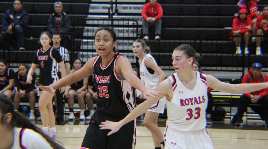 The Panthers started the second quarter with seven straight points to make the score 20-10 with 5:50 on the clock. The Panther’s scoring came from Kylee Falatea making a jump shot, junior Honey Hamilton making a three-point basket, and senior Emma Aiona making a layup. Royal’s senior Lylian Rosenberg ended the Royals scoring drought by making a layup. West freshman Laite Latu then quickly responded with two straight layups; the score was 24-12 with 5:00 left in the second quarter.