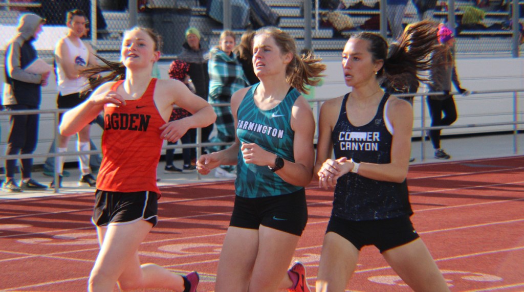 Corner Canyon High School junior Paige Rhoads captured the win in the 800m in 2:20.55, a personal best time. Jorgensen finished second in her season-best time of 2:21.70, and Layton’s Carli Nelson was third in 2:22.66, a personal best time.