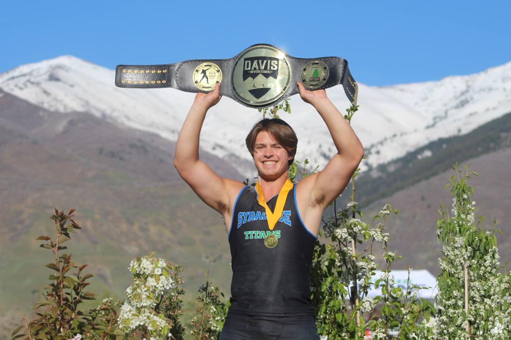 Championship belts made by Salt City Swagger were presented to the first-place finishers in the shot put and high jump field events. Syracuse High School freshman Jace Cook took home first place and the belt with a winning throw of 59’1.5″. Mountain Ridge High School senior Adam Hawkes won the discus event with a throw of 178’5″. Copper Hills High School junior Keaton Peery captured the javelin title with a throw of 177’7″.