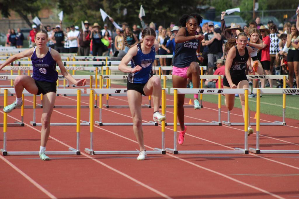 Davis High School senior Aubrey Rowe pleased the home crowd with a first-place finish in the open division 100mh in 16.85. Kate Glazier of Lehi High School was second in 16.90. Fremont High School junior Aubrey Ostler crossed the line in third place in 16.92