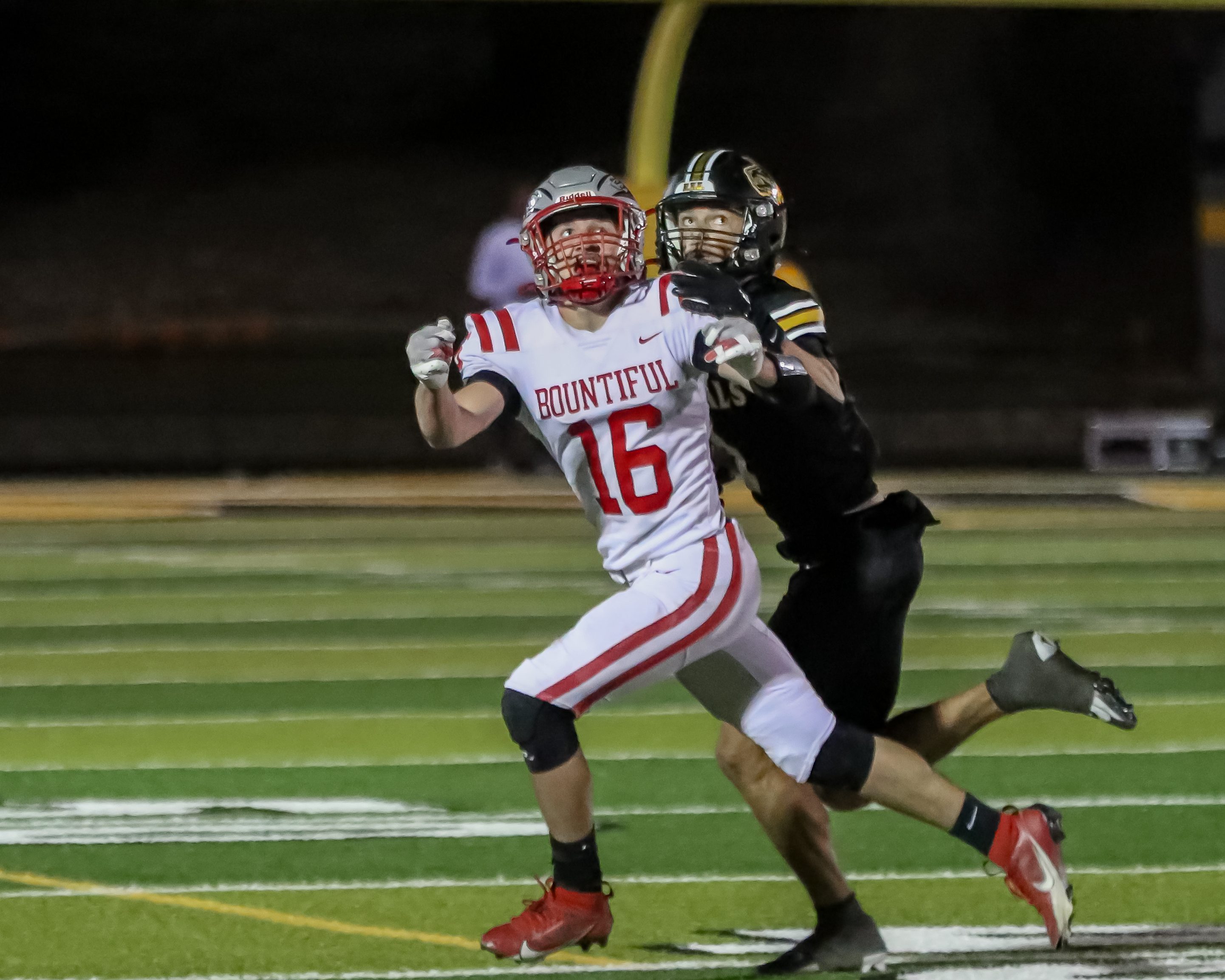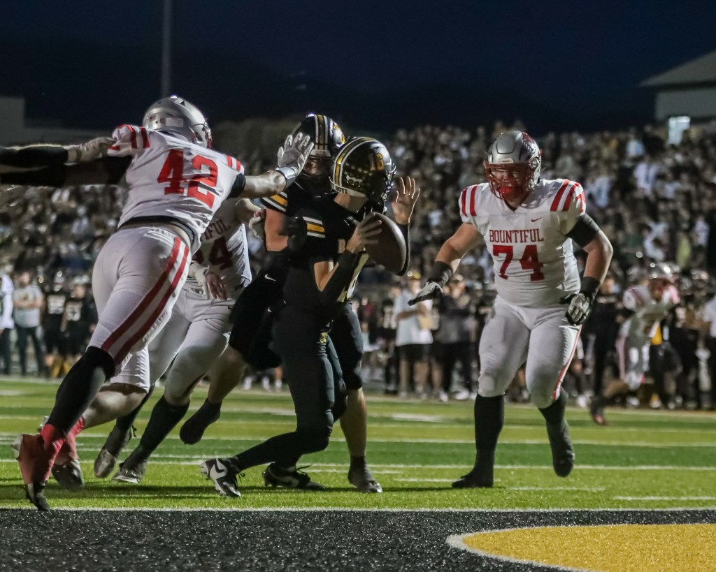 In a battle of top teams in Region 5, the Bountiful Redhawks (8-1) go on the road and defeat the Roy Royals (8-1) 42-35 in an all-time classic game. The Redhawks, determined to avenge last season’s loss to the Royals, used the last minute of the first half to change the game’s momentum. The Redhawks would have a goal-line stand in the last second to seal the victory and move into a tie for the Region 5 title with one game left on the schedule. The Royals entered the game as the favorite and had an undefeated season on the line, but the Redhawks were ready for the challenge.