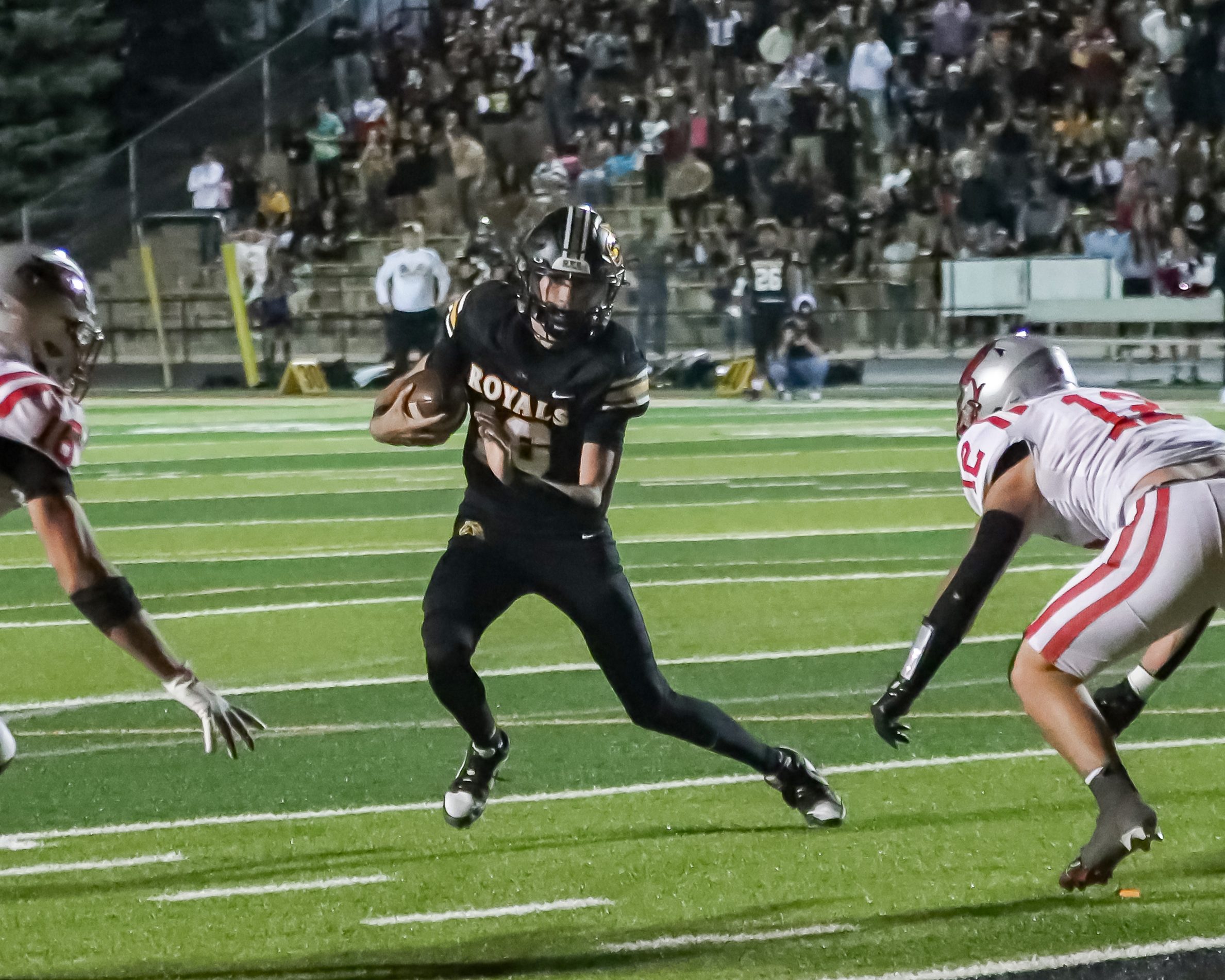 Geilman played an outstanding game, gaining 240 yards and scoring six touchdowns, two rushing and four passing. Tidwell made big plays on offense and kept the Royals from having long touchdown passes on defense from his free safety position.