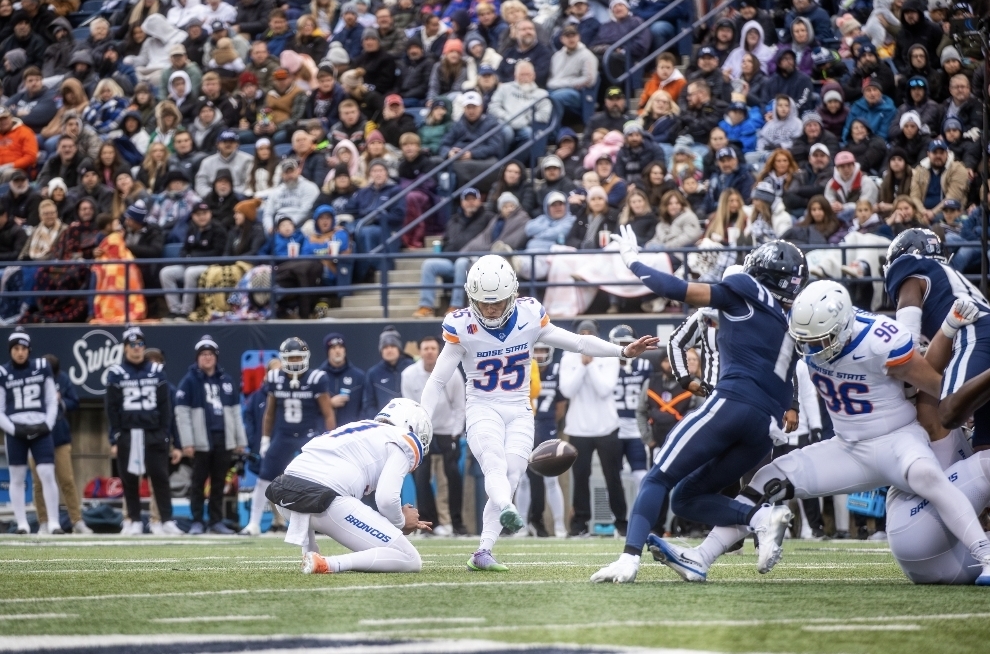 Utah State came to play! They took an early lead with a touchdown run by senior QB Bryson Barnes. After an outstanding defensive stand by the Aggies, Boise State settled for a 27-yard field goal by Colton Boomer. The placeholder was Oscar Doyle (punter and former Weber State Wildcat).